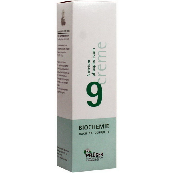 Biochemie Pflüger® Creme Nr. 9 Natrium phosphoricum ist ein registriertes homöopathisches Arzneimittel, daher ohne Angabe einer therapeutischen Indikation. Bei Fortdauern der Krankheitssymptome während der Anwendung soll medizinischer Rat eingeholt werden.