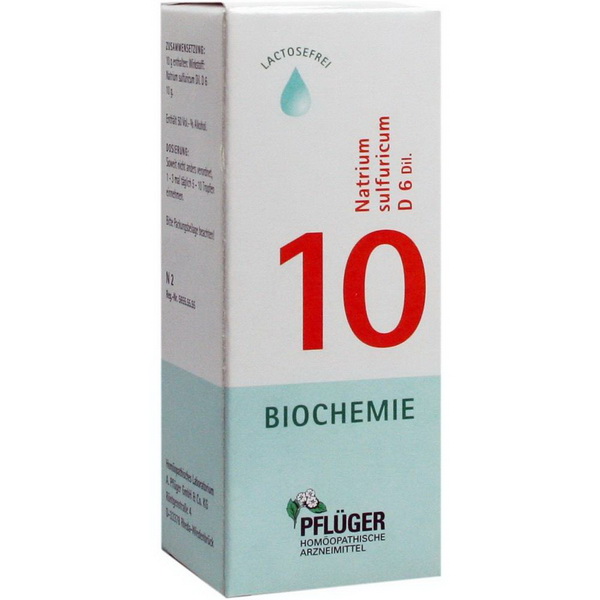 Biochemie Pflüger® Nr. 10 Natrium sulfuricum D 6 Dil. ist ein registriertes homöopathisches Arzneimittel, daher ohne Angabe einer therapeutischen Indikation. Bei Fortdauern der Krankheitssymptome während der Anwendung soll medizinischer Rat eingeholt werden.