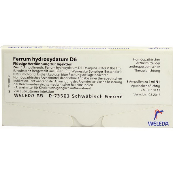 1 Ampulle enthält: Wirkstoff: Ferrum hydroxydatum Dil. D6 aquos. (HAB, V. 8b) 1 ml. (Ursubstanz hergestellt aus Eisen und Weinessig)