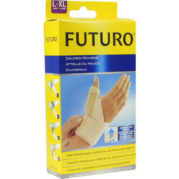 Dank ihres besonders weichen und atmungsaktiven Materials lässt sie sich den ganzen Tag über angenehm tragen – die übrigen Finger werden dabei nicht behindert. Die FUTURO™ Daumen-Schiene ist sowohl links- als auch rechtsseitig tragbar und ist leicht anzulegen und abzunehmen. Sie wurde in Zusammenarbeit mit Fachärzten und Physiotherapeuten entwickelt.