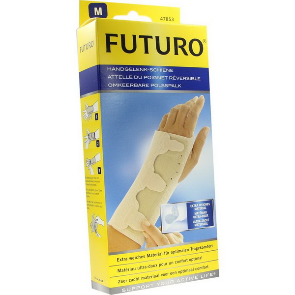 Die FUTURO™ Classic Handgelenk-Schiene in Größe M dient der festen Stabilisierung des Handgelenks und hilft bei der Linderung von akuten Reizungen (z. B. Karpaltunnelsyndrom), Überlastung und degenerativen Schmerzen. Die Schiene kann auch nach Ruhigstellung (z. B. nach Tragen eines Gipses) verwendet werden. Die Schiene trägt sich sehr angenehm dank ihres extra weichen, hautfreundlichen und atmungsaktiven Materials. Dabei sitzt sie optimal und stabilisiert je nach individueller Einstellung das Handgelenk. Vier Verschlüsse garantieren einen perfekten Sitz. Eine individuell einstellbare Ruheposition ist durch ihre formbare Aluminiumschiene möglich. Die FUTURO™ Classic Handgelenk- Schiene ist sowohl links- als auch rechtsseitig tragbar. Sie wurde in Zusammenarbeit mit Fachärzten und Physiotherapeuten entwickelt.