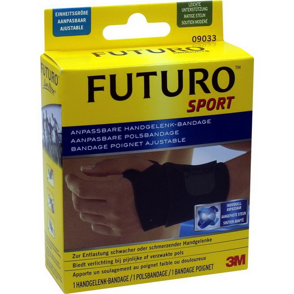 Die FUTURO™ SPORT Handgelenk-Bandage in der Einheitsgröße lindert Ihre akuten oder chronischen Schmerzen und hilft bei Überlastungssyndrom oder leichten Distorsionen. Die Bandage trägt sich äußerst angenehm dank ihres weich gepolsterten, hautfreundlichen und atmungsaktiven Materials.